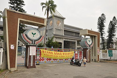 這就是學校的大門,這個校門是我在學時興建的,但是門前的宣導布幕蠻妨礙觀瞻的。兩旁的黏貼的禁