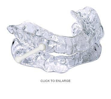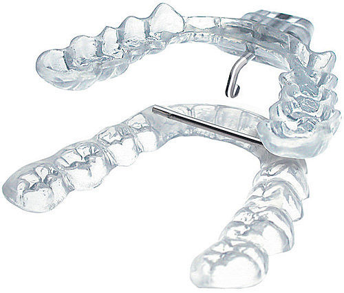 口腔止鼾器,藉由顎間撐開固定裝置,在睡覺時將患者下顎和舌頭往前下拉,以打開患者在睡眠時塌陷的呼吸道,有效的改善呼吸中止和缺氧的情形,也可增加咽喉、舌頭與軟顎的肌肉張力,打開患者在睡眠時塌陷的呼吸道以獲得有效的改善,裝置針對病患個別訂做,裝止鼾器後,做睡眠程度檢查,藉以確定發揮療效,止鼾器的優點包括體積小、患者裝戴容易,無異物感,舌頭仍可自由活動,患者能用口腔呼吸,且特定的止鼾器下顎可橫向左右移動,並張口活動。