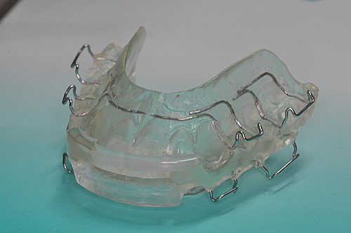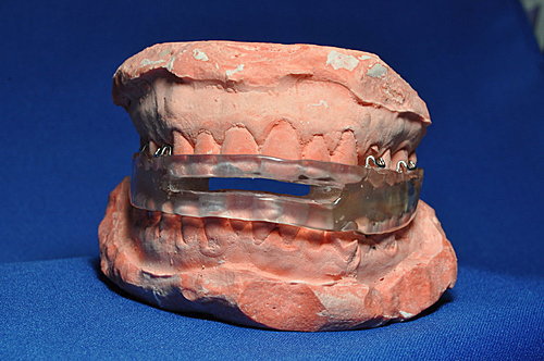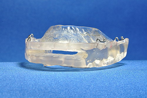 .口內裝置: 利用各種不同形式的口腔矯正器,將下顎及舌頭拉向前方,以此擴大呼吸道來減少呼吸阻塞。此項裝置必須針對病患個別訂做,且因為各家製作的方式不同,所以效果不一,目前相信是對輕度病患較會有助益。其優點是病患接受度及遵醫囑性較高。